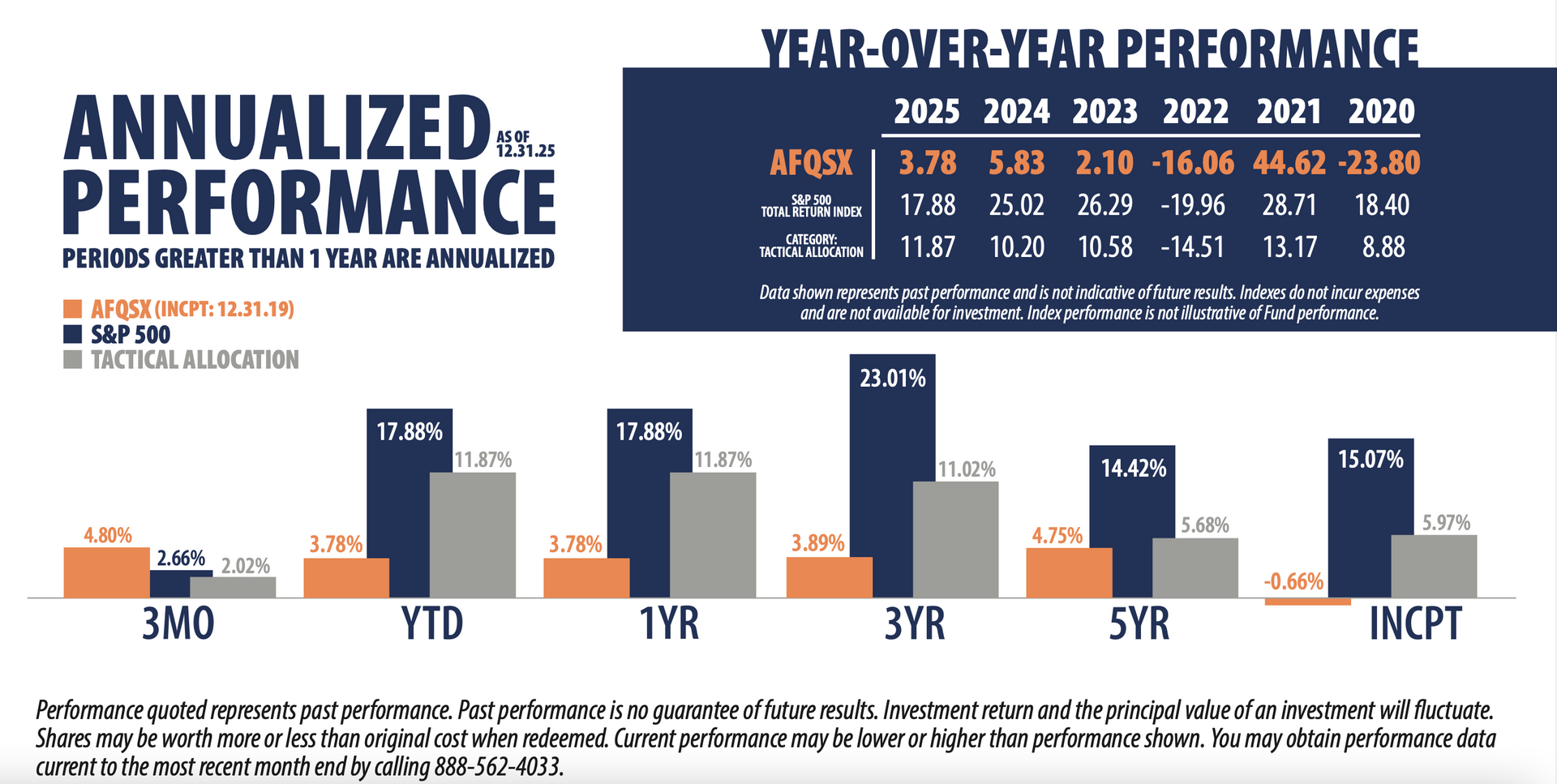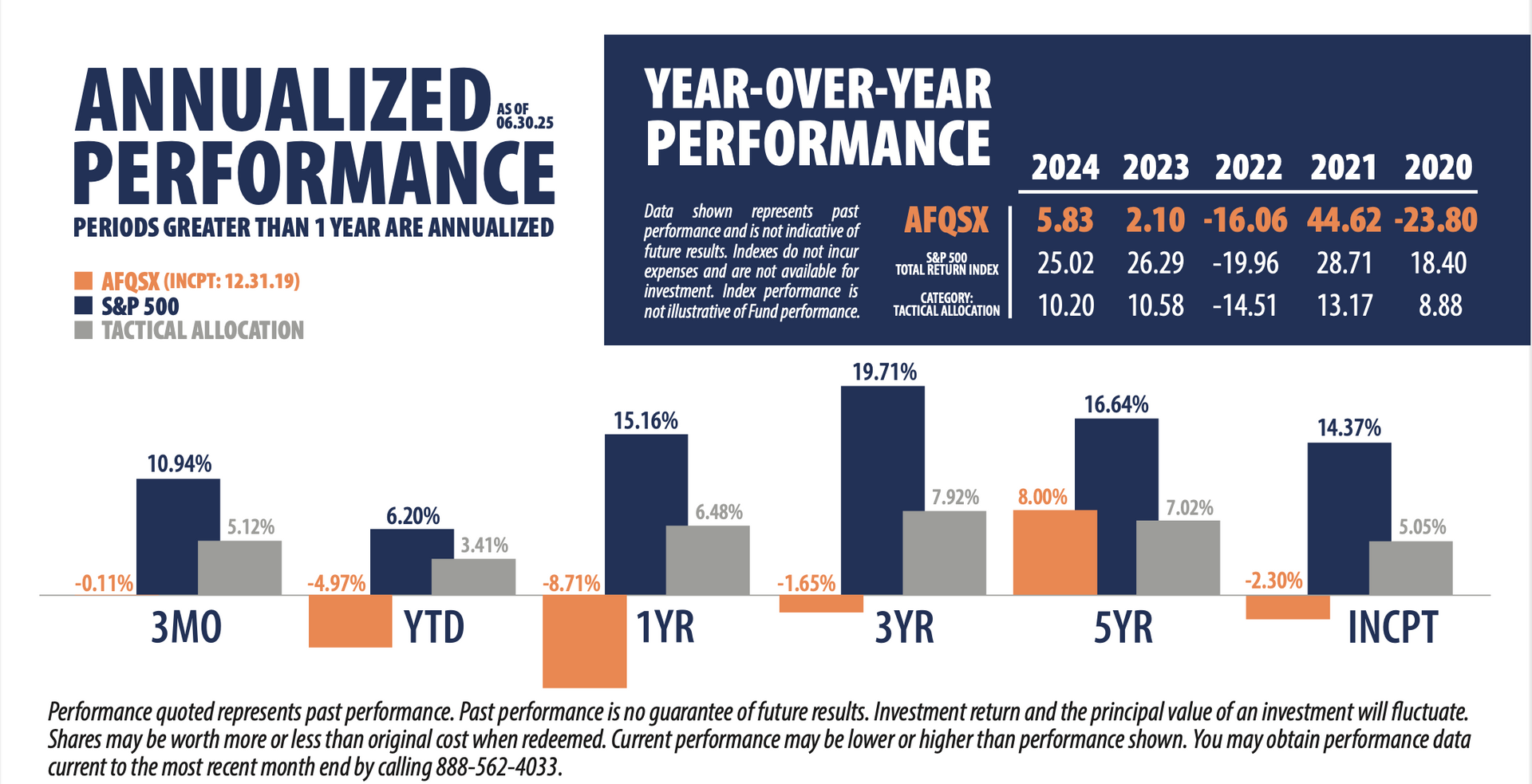Systematically deliver a tactical tilt to your overall portfolio making your allocations more responsive to market conditions. Given AFQSX’s -105 to +165% tactical equity exposure, adding AFQSX to your portfolio may potentially improve portfolio upside/downside capture over time. Many investors desire to improve their upside capture during rising market trends, adding AFQSX to their portfolio may help them to achieve this goal.